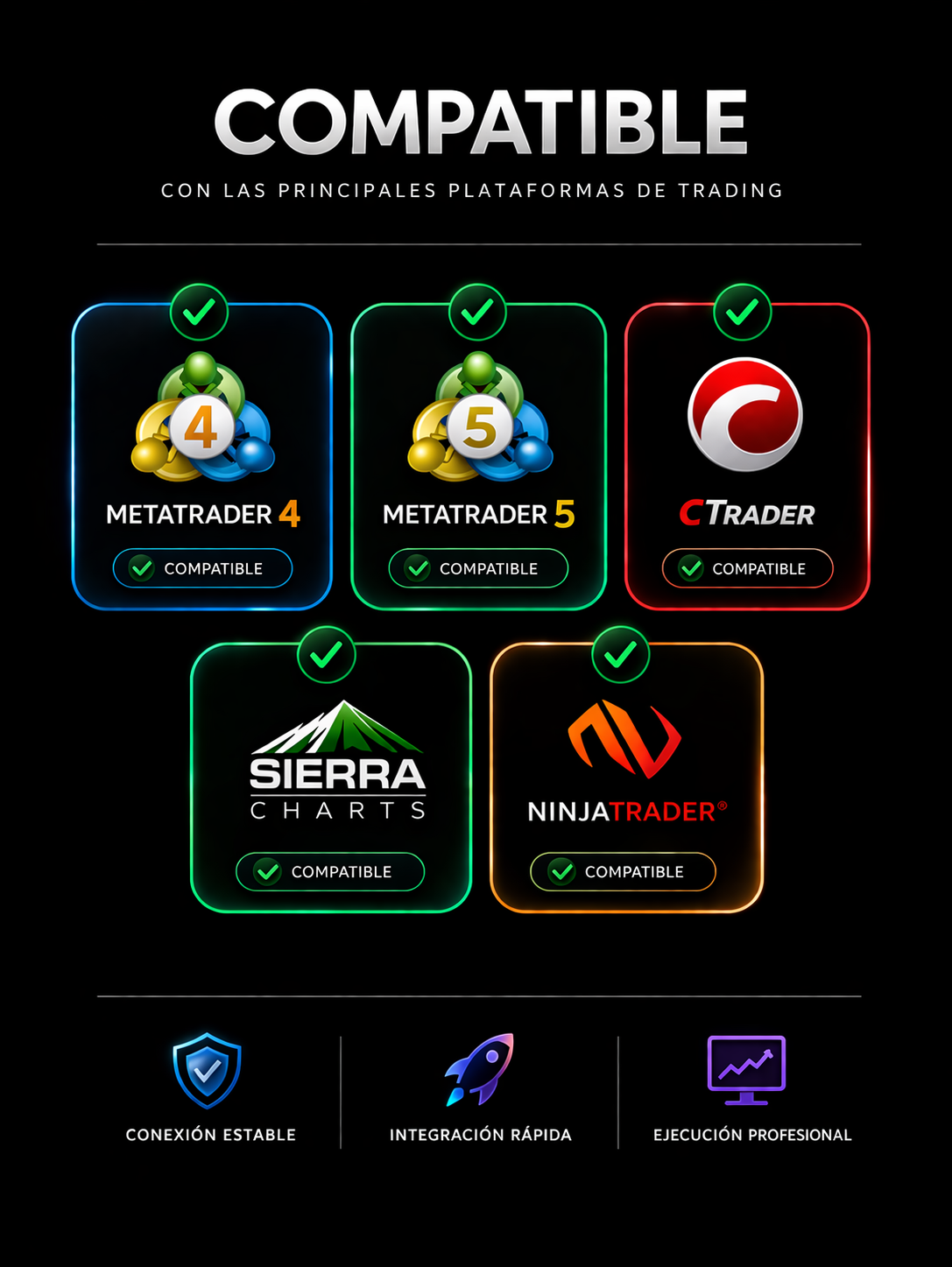 Funciona con plataformas como MetaTrader 4/5, cTrader, NinjaTrader y SierraChart.