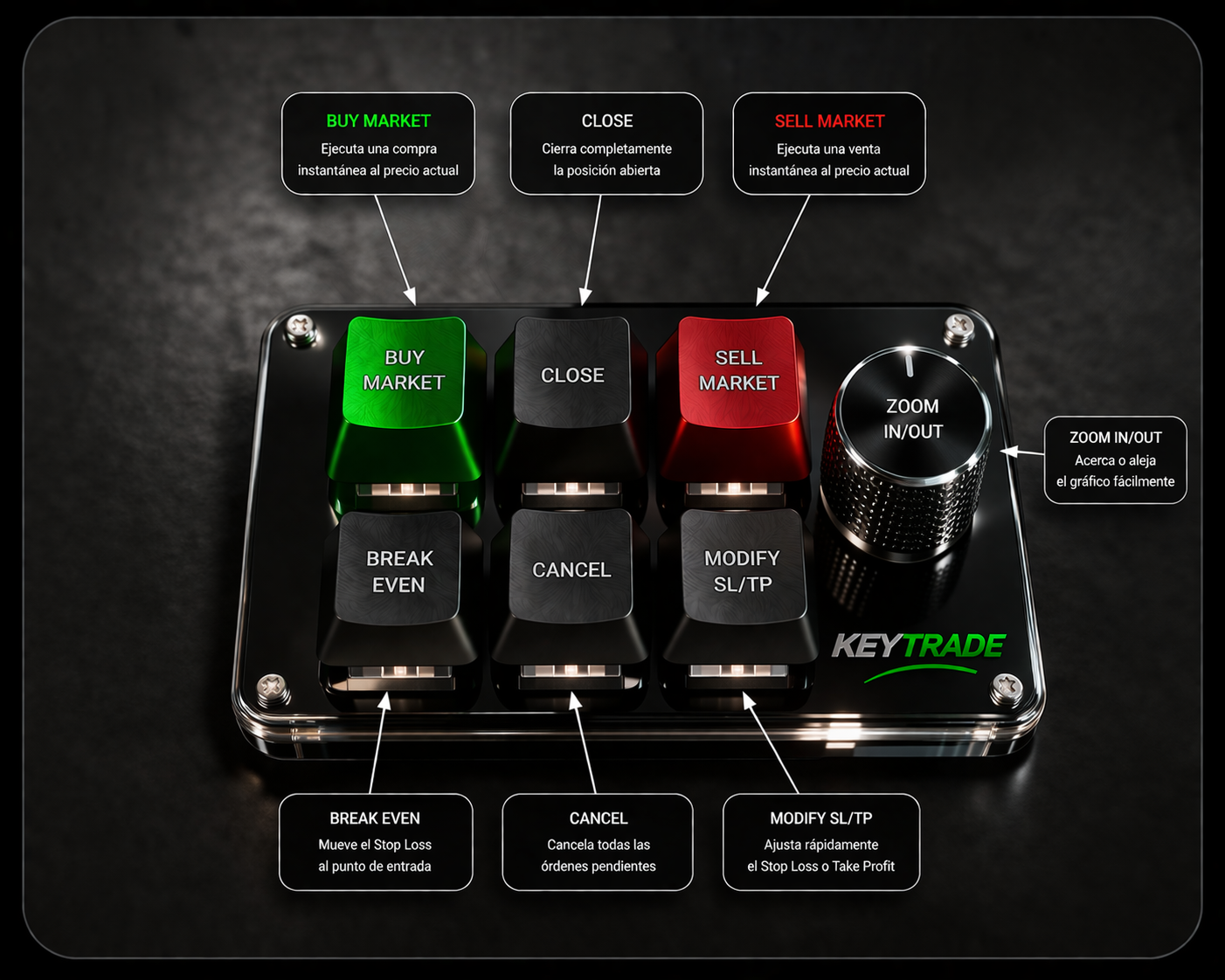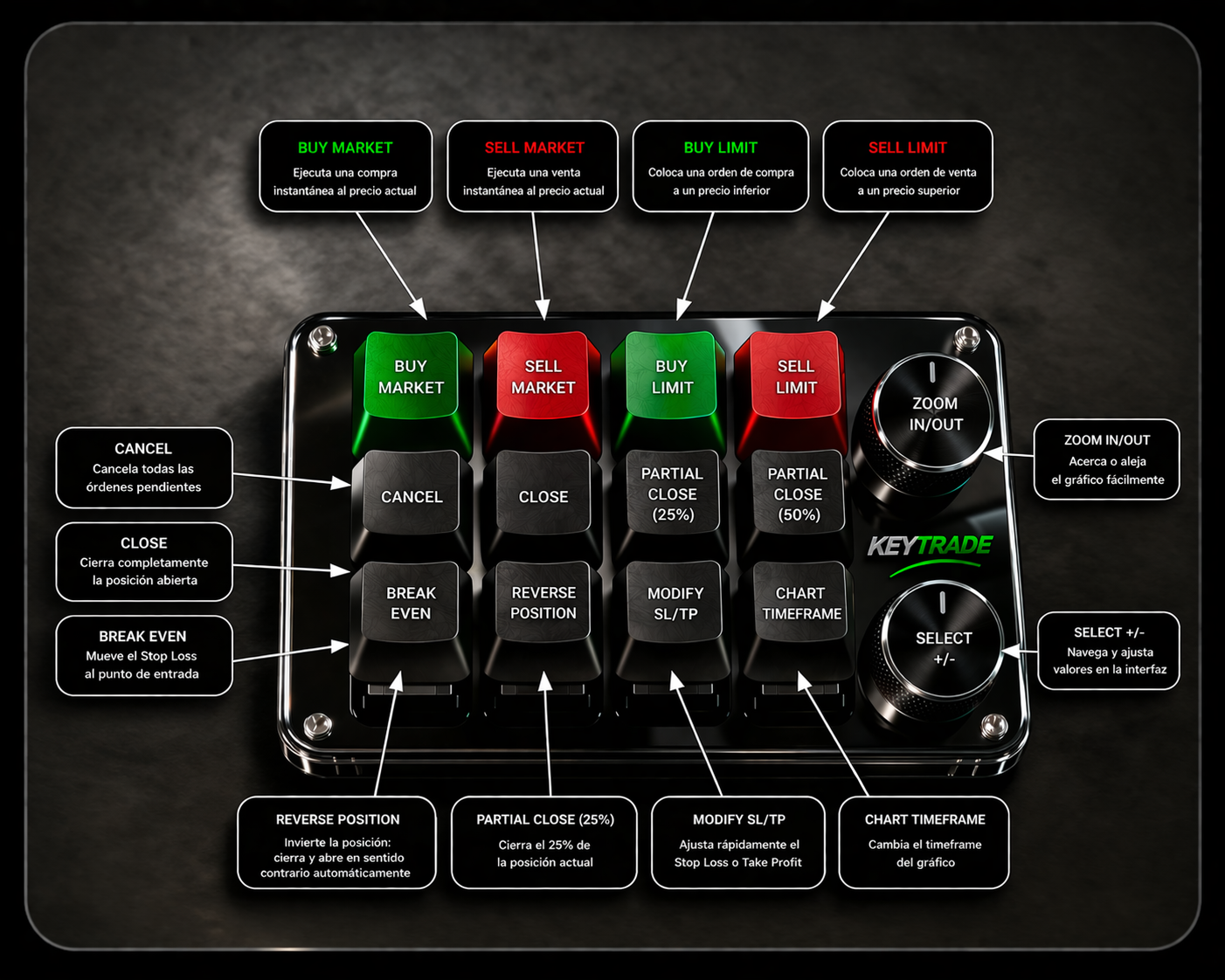 Es un dispositivo físico con botones programados que te permite ejecutar acciones de trading con un solo clic (comprar, vender, cerrar, etc.).
